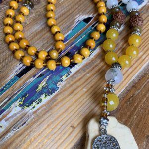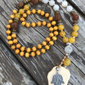 This is one of our favourite necklaces… Was made it with yellow and white high-quality gemstones, Rudraksha beads and wood beads…. it has a charming natural stone pendant and a little touch of Hamsa Charm.