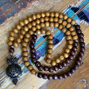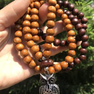 The necklace is made of high-quality nickel-free 3D metal owl pendant. Also a combination of 108 wood beads, a combination of 2 different colours, they are 10 mm.